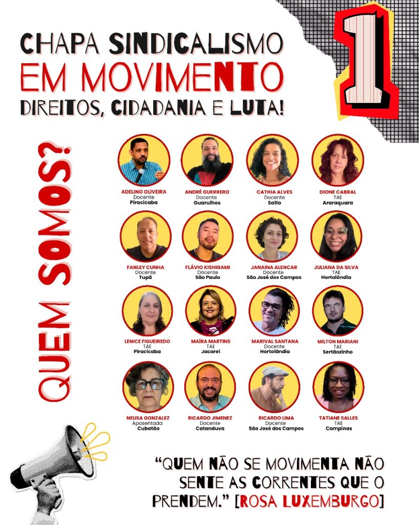 A Chapa 1 é composta por servidoras e servidores que estiveram presentes na construção das lutas centrais do sindicato na fase recente: participação direta na greve de 2024, enfrentamento ao assédio institucional no IFSP, incidência política em nível nacional e estadual, fortalecimento da comunicação sindical, articulação com movimentos sociais e produção de formação política. É esse acúmulo concreto que orienta o programa que apresentamos para 2025-2027.