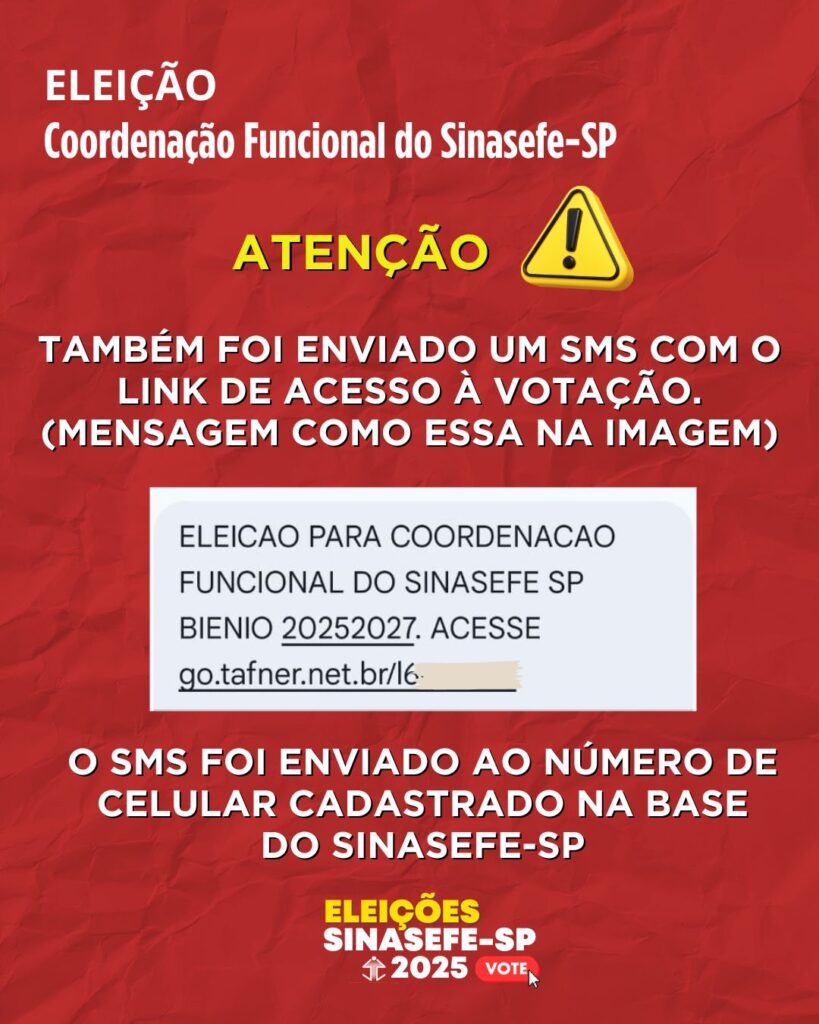O sistema de votação enviou automaticamente um SMS contendo o link de acesso individual. A mensagem foi encaminhada ao número de celular registrado na base de dados do SINASEFE-SP.